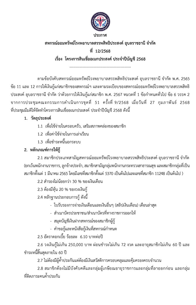 - ให้สมาชิกรับทราบและตอบยืนยันยอดทุนเรือนหุ้น เงินรับฝาก และลูกหนี้เงินกู้ ประจำปี 2568